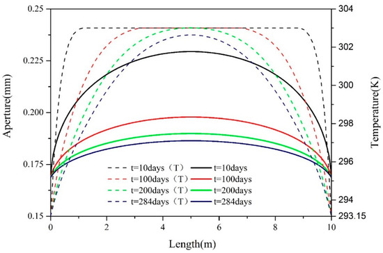 The evolution of hydraulic fracture aperture and temperature in hydraulic fracture at different times.