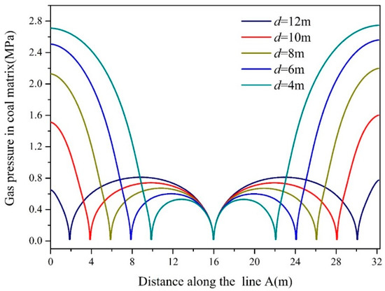 Gas pressure distribution of the matrix along line A under different directional distance after 284 days extraction.