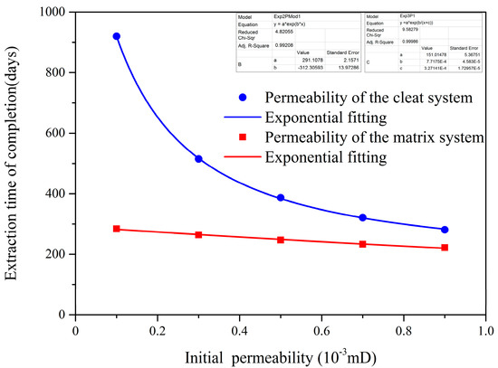 The matrix and cleat permeability also played a crucial role in CMM extraction. As is apparent from Figure 14, the extraction time of completion was shorter for the matrix and cleat system with higher permeability. When km0 or kf0 increased from 0.1 × 10−3 mD to 0.9 × 10−3 mD, the extraction time of completion decreased by 21.8% and 69.5%, respectively. The extraction time of completion was more sensitive to the cleat permeability than to the matrix permeability. Since high permeability of the cleat system improved gas extraction efficiency, many fracture treatment methods were adopted to create bigger fractures within the coal seam and enhance its permeability.