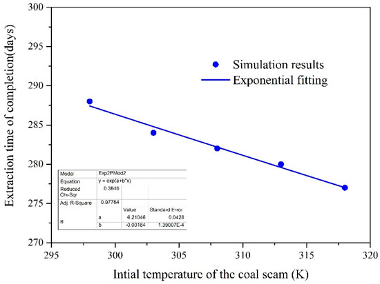 Temperature was also a key parameter for gas extraction that cannot be neglected. Figure 15 illustrates that the effect of the initial temperature on extraction completion time. The figures shows that increasing the initial temperature of the coal seam could decrease the time needed to complete extraction, by 3.8% when the initial temperature was increased from 298 K to 318 K. The data demonstrated that higher temperatures were conductive to faster gas extraction from a coal seam. If gas was extracted from a higher temperature coal seam, more methane desorption and temperature reduction would cause the coal matrix to shrink and increased the cleat permeability. Methane would move into boreholes more easily.
