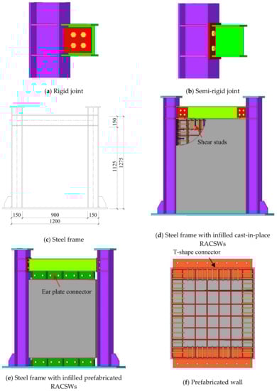 (4) The bearing capacity and initial stiffness were 1.44 and 2.8 times higher in the steel frames with infilled prefabricated RACSWs than those in the pure steel frame, and the displacement ductility factors were from 3.32 to 3.40. The difference in bearing capacity of the specimens in the welded–bolted and end-plate joints was only 4%, and the turning capability and ductility were better in the semi-rigid joints than in the rigid joints.