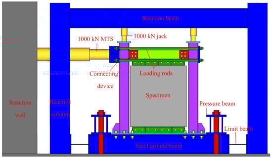 The test loading device is illustrated in Figure 3. The specimen was anchored on the ground beam with M30 bolts, and both ends of the ground beam were fixed in the laboratory by pressure beams. The horizontal load was applied by a 1000-kN MTS actuator, and the vertical load was applied by a 1000-kN hydraulic jack. A lateral brace was provided at the end of the MTS actuator, and the outside displacement of the specimen was limited by two groups of pulleys to ensure that the specimen and actuator moved in the horizontal direction. The displacement and strain gauges were arranged in the key parts to study the seismic behavior of the SFIRACSWs, and data were collected by a TDS-630 acquisition instrument. Concrete cracking, buckling of beams and columns, and specimen failure were constantly observed during the test.
