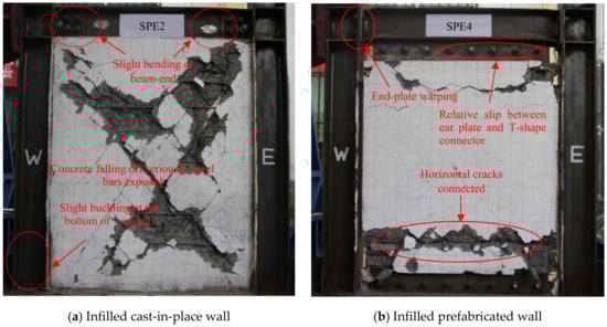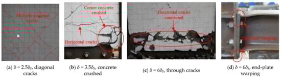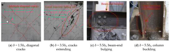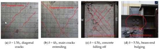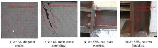 The cracks at the control stage of displacement 1.0–3.0 δy continued to expand and extend to the edge of the wall, thereby forming through cracks with a width of 2–3 mm along the diagonal direction (Figure 6a). The concrete partly fell off on both sides of the principal diagonal cracks when the displacement was 4.0 δy, and the width of the cracks reached 4–5 mm (Figure 6b). Considerable concrete fell off at the intersection of the cracks along the diagonal when the displacement was 4.5 δy. The local steel bars were exposed. Then, the flange at the end of the beam bulged upward. A large area of concrete fell off when the displacement was 5.5 δy. Then, many holes appeared on the wall. Numerous steel bars were exposed and the wall was seriously damaged. Furthermore, the end-plate warped (Figure 6c). The middle part of the column bulged outward and the column base buckled (Figure 6d). Finally, the horizontal load decreased by more than 15%, and the specimen lost its carrying capacity.