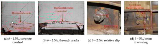 In the displacement control stage, multiple short cracks with a width of approximately 1 mm appeared along the diagonal direction of the wall when the displacement was 1.5 δy. The concrete at the lower right corner of the wall began to fall off, and the number of horizontal cracks gradually increased (Figure 7a). Cracks in the horizontal direction formed at the bottom of the wall when the displacement was 2.5 δy (Figure 7b). The upper ear plate had a relative slip of approximately 10 mm with the T-shape connector (Figure 7c) accompanied by a friction sound among steel plates. Bending deformation occurred on the wall when the displacement was 4.5 δy. Then, the corner concrete fell off, exposing the steel bars. The top flange of the steel beam exhibited a brittle fracture when the displacement was 5.0 δy (Figure 7d), and the column base buckled locally. Finally, the horizontal load was reduced by more than 15%, and the specimen lost its carrying capacity.