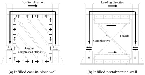 The transfer mechanism of the lateral load of steel frames with infilled cast-in-place RACSWs is illustrated in Figure 10a. In the initial loading stage, the horizontal load was mainly resisted by the compressive strips of the wall along the diagonal direction under the effect of the extrusion pressure of the steel frame and the horizontal shear force transferred by the shear studs. With the increase in horizontal load, the wall was divided into multiple diagonal compressive strips. Then, the concrete at the compressive strips was gradually crushed. The wall gradually failed. The horizontal load was then mostly borne by the steel frame, and the bearing capacity and lateral stiffness of the specimens decreased sharply. The structure of the infilled cast-in-place RACSWs satisfied the requirements of double seismic fortification.