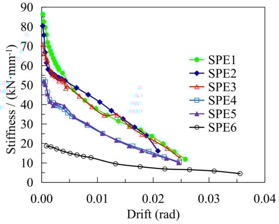 The stiffness degradation curves of the specimens are presented in Figure 13. The values of stiffness on the main stages are provided in Table 5, where θ is the horizontal drift angle of the specimen, and K0 is the initial stiffness of the specimen. Figure 13 and Table 5 present the following: