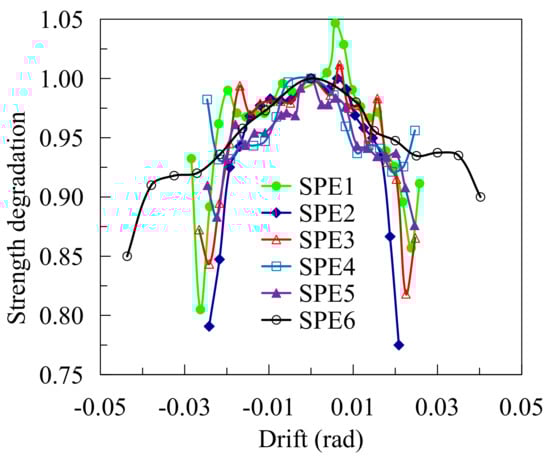 (3) The degradation coefficients of the bearing capacity of SPE4 and SPE5 are close when the horizontal drift angle is less than 0.02 rad. The degradation law is consistent, denoting that the damage degree of the specimens of infilled prefabricated RACSWs is the same under the same drift angle. Furthermore, the connecting stiffness of BCJs slightly influences the strength degradation of the specimens of infilled prefabricated RACSWs. The degradation coefficients of the bearing capacity of the specimens of infilled prefabricated RACSWs are more than 0.85.