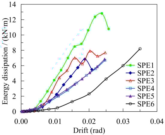 The energy dissipation capacity of the specimens is expressed by the relation curves between the hysteretic loop area and the horizontal drift angle, as shown in Figure 15. The values of energy dissipation in the main stages are presented in Table 8.