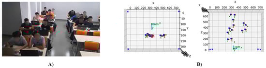 (A) The frame acquired from the camera. (B) Estimated locations of each student in the sample. The image on the left side illustrates student points in the 3D coordinate system with the perspective from the board. Likewise, the right one represents perspective from top to bottom. The blue x’s represent four room corner points, which belong to the space containing the board. Pairs of and points are denoted in red and blue dots respectively.
