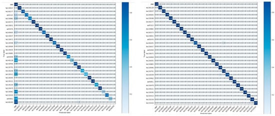 Confusion matrix of ID identification task: no assist (left) and semi-assist (right).