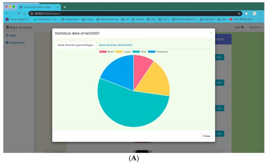 For the result-visualization task, combined with gaze classification, we divide our dataset into four classes: board (student gazes at the board), laptop (student gazes at the laptop), other (student gazes at the others), and undetected (student is undetected). In order to make the data visualization task clearer and more understandable, we propose two types of charts—a pie chart and an area chart, as in Figure 8. The pie chart (Figure 8A) illustrates the numerical proportion of gaze direction data during the class. The arc length of each slice (or its central angle and area) is proportional to the quantity of corresponding class it presents. From the chart, we can see that the “other” gaze class has the greatest quantity, while the class of “board” takes the least amount. The percentages of “laptop” and “undetected” classes are quite similar. The area chart (Figure 8B) represents cumulated total number of appearances of gaze classes over time. With the chart, we are able to observe how just one quantity of class changes, or it will show us the changes in many quantities over time. Concretely, we divide each lecture duration into time windows, as horizontal axes (e.g., 211 windows in the above area chart). On each time window, we proceed to take a fixed number of gaze evaluations. In particular, there are 100 gaze evaluations on each window in the chart 8B, corresponding with 100 total appearances of gaze classes, as the vertical axis. On the window 100 (with 0-index), for example, the number in the “board” class is approximately 50; it is about 40 for “laptop”; the amount is over 10 for the “other” gaze class; and for class “undetected,” there is no recorded result. Just a quick glance at the aggregated results from the web app teacher can capture the overall situation of each individual student in the classroom, which they can hardly achieve by a manual process when the number of students is large.