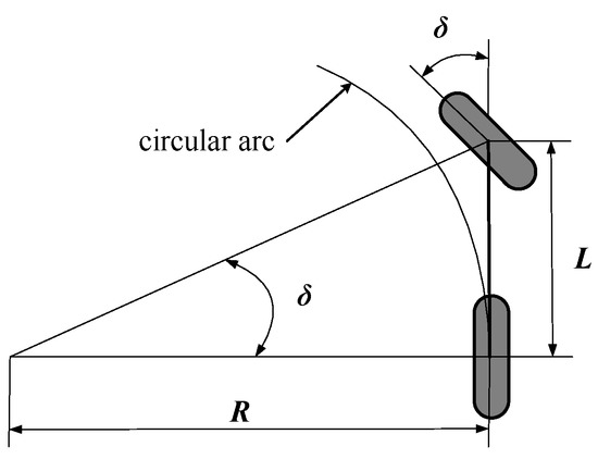 As shown in Figure 1, a path tracking controller was designed based on Ackerman’s steering geometry method. Ref. [6] adopted the pure pursuit method, path tracking controllers with deviation-based adaptive preview distance velocity were built and compared with lateral position deviation-based controllers. Ref. [7] proposed a path tracking fuzzy controller based on the clothoid curve-fitting reference path. A preview Stanley path tracking controller was designed in [8]. The vehicle kinematics model was also built to design path tracking controller based on pure pursuit method in [9], shown in Figure 2. This type of method is simple and works well in many situations. However, it is only suitable for the conditions where vehicle speed is low, and the path curvature and curvature change rate are small, due to the lack of consideration of vehicle dynamics. The control accuracy of these methods is obviously dependent on the preview information and the scenario applied.