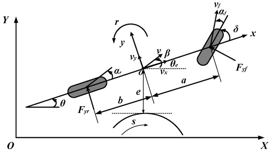 where vx and r are the lateral speed and yaw rate, respectively; Fyf and Fyr are the lateral tire force of the front and rear axles, respectively; δ and θ are the front steering angle and heading angle, respectively; a and b are the distance from the center of mass O to the front and rear axles, respectively.