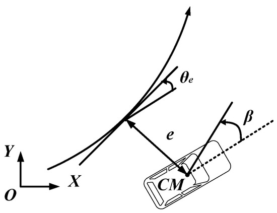 The path tracking model is shown in Figure 5, illustrating the relationship between the lateral deviation e, the heading deviation θe, and the distance s along the path. In most of the existing path-tracking controllers, the lateral deviation e, the heading deviation θe are chosen as the reference states [28,29,32,33], solving the optimization problem by minimizing e and θe. However, path tracking lateral deviation is minimized when vehicle sideslip is held tangent to the desired path at all times [19,20,37]. Therefore, the course deviation Δφ is chosen as the reference state in this paper, and the path tracking model can be expressed as: