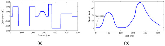 In order to verify the performance of the proposed controller, we designed the reference path, which is parameterized as a curvature profile and position profile, as shown in Figure 6. The path generation methods were proposed in [22,29]. The longitudinal speed tracking was achieved using a PID controller, the longitudinal speed fluctuated between 55–65 (km/h) in order to verify the proposed controller.