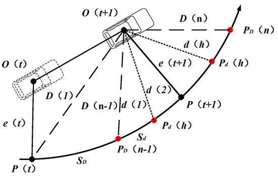 Step 1: The reference point P(t) of t previous moment t is the initial point PD(1) of current moment (t + 1), calculating the distance D(1) between the vehicle mass center O(t + 1) and PD(1).
