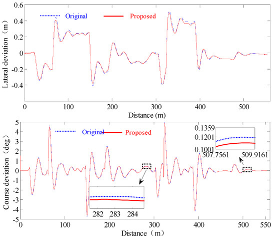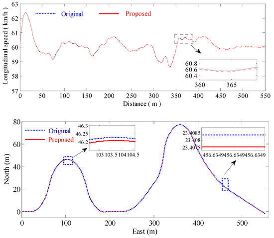 Figure 8 shows the simulation results of the tracked path of different controllers. The vehicle longitudinal speed curves are highly similar under the action of two controllers. The deviation occurred near the position where the curvature changes greatly. Both controllers can track the reference path precisely. Figure 9 shows the simulation results of the lateral deviation and the course deviation of different controllers, and the statistics for the results are shown in Table 2. The maximum absolute lateral deviation occurred near the position where the curvature changes greatly. When the reference path curvature changed greatly, the vehicle tracking performance became worse due to the controller, vehicle inertia and other factors. The proposed controller performed better; the performance difference analyzed by these indicators allowed us to find the average value of absolute lateral deviation, the average value of absolute course deviation, the mean squared error of absolute lateral deviation and the mean squared error of absolute course deviation. The proposed controller reduced the average value of absolute lateral deviation by 5% and reduced the average value of absolute course deviation by 4.5%. The tracking error was relatively small for both controllers when the path changed gently, shown in Figure 6 and Figure 9. The tracking error increased significantly when the path changed suddenly. However, the proposed controller performed better, especially when the path curvature varies suddenly.
