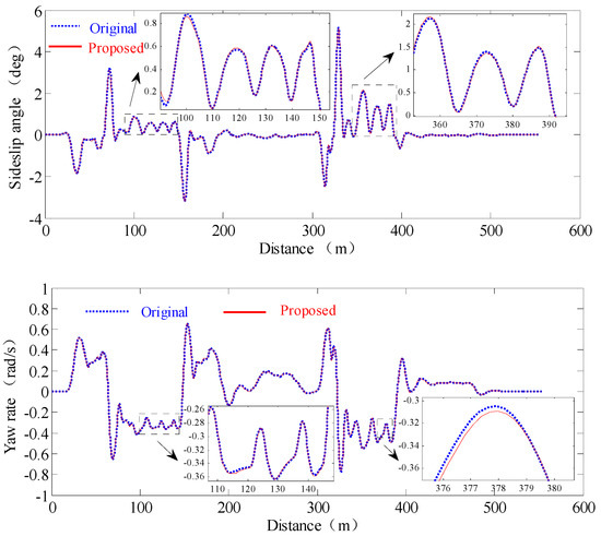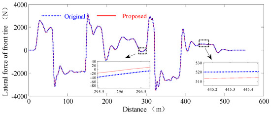Figure 11 shows the lateral force of the front tire of different controllers. The maximum value of lateral force occurred near the position where the curvature changed greatly and the tracking error appeared to be maximal, as shown in Figure 6 and Figure 9. The proposed controller output was relatively small compared to the original controller, which improved the economy of control. The vehicle sideslip angle fluctuated from −5° to 5° of controllers, and the vehicle yaw rate ranged from −0.8 rad/s to 0.8 rad/s, the results indicate that the vehicle maintained stability, as shown in Figure 12. Thus, the simulation results show that the proposed controller exhibits better tracking performance.