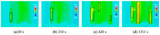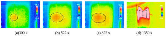 As shown in Figure 4a, the temperature rose from 28.6 °C (i.e., the initial temperature) to 29.1 °C in 300 s, due to the release of energy accumulated in air bubble. The temperature variation mainly appeared in a circular area with a radius of 2 cm from the centre of the bubble. The bubble image was blurry, due to the bubble being located near the edge of the specimen. However, it was clear that the temperature in the centre of air bubble was always the highest, due to the stress disturbance with localized features. The stress region that was transmitted through this centre point was broader. Since the ply angles of A1 was [45/−45]s, the bridging between fibers was good, and the stress was not completely concentrated on a certain fiber, but was dispersed to the surroundings.