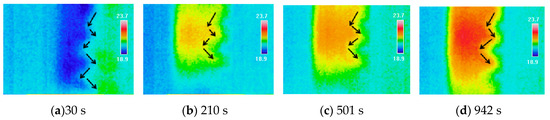 In Figure 5a, at the initial stage of test, the overall temperature difference of the specimen A2 was not obvious. The highest temperature value was approximately 0.2 °C higher than the initial temperature. The profile of bubble was blurry. As the bubble was extremely small, the temperature variation of the bubble was not obvious, the specimen was a uniform temperature distribution, and the difference between the maximum temperature and minimum temperature was only 0.6 °C.