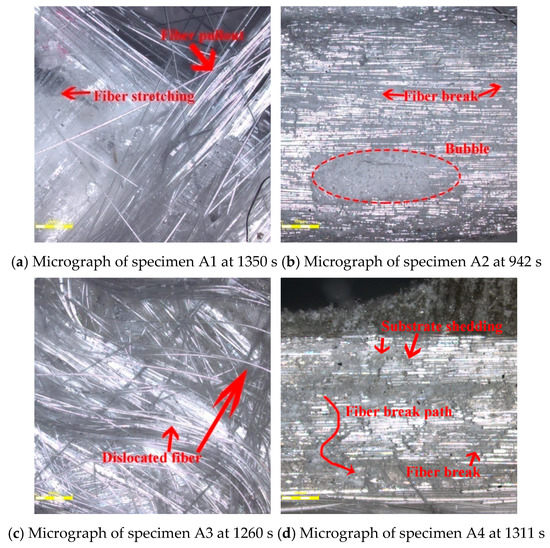 As introduced in Section 2, there will always be a critical moment when the temperature jump occurs. The temperature jump could be captured by thermal camera. As shown in Figure 8, a laser scanning confocal microscope OLS4100 was used to observe the fibers distribution at the critical moments in order to observe the actual damage inside the specimen, which consisted with the time of Figure 4d, Figure 5d, Figure 6d, and Figure 7d.