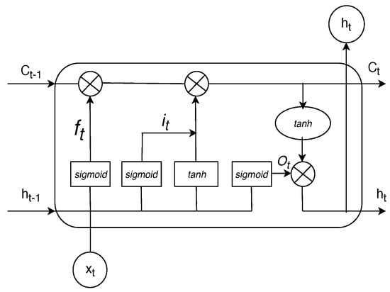 Long short-term memory (LSTM) is a specific recurrent neural network (RNN) architecture. It can learn temporal patterns from sequential data, and overcomes the vanishing gradient problem in a standard RNN [8]. Moreover, LSTMs have gating mechanisms to regulate the flow of information. The amount of information that will be retained is systemically determined at each time step. Therefore, LSTMs can memorize temporal patterns over a long time series. The architecture of an LSTM cell is illustrated in Figure 1, in which , , and are defined as the input, the hidden state, and the cell state, respectively, at time t. An LSTM cell has three gates: , , and , which are called the forget gate, the input gate, and the output gate, respectively. Note that ⊗ is point-wise multiplication. and activation functions are marked as and , respectively. Here, the activation function is defined as . The function is used in order to update the hidden state. Moreover, the activation function is defined as . The function helps form the output value in the range of . If the output is close to 0, most information is lost. If the output value is close to 1, it means that more information is allowed.