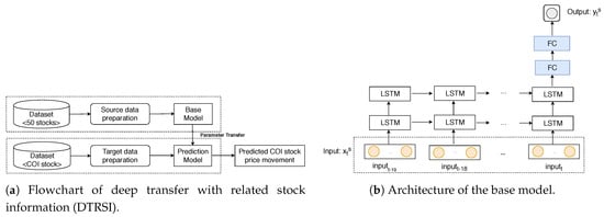 In recent years, transfer learning has been popularly used in training deep neural networks (DNNs) owing to the effectiveness of this technique in helping to reduce training time and to enhance prediction accuracy, despite a small amount of training data [14,15,16,17,18,19]. However, transfer learning has not been used much in time series prediction tasks. In this paper, we propose a framework called deep transfer with related stock information (DTRSI) to predict stock price movement, to mitigate the overfitting problem caused by an insufficient number of training samples, and to improve prediction performance by using the relationships between stocks. Specifically, our framework has two phases. First, a base model using LSTM cells is pre-trained with a large amount of data (which were obtained from a number of different stocks) to optimize initial training parameters. Secondly, the base model is fine-tuned with a small amount of the target stock data to predict the target stock’s price movement. The fine-tuned model is called a prediction model. For convenience, the target stock is called the company of interest (COI) stock. In addition, the prediction model is trained by using the different sets of input features that are constructed based on information about stocks related to the COI stock. In detail, we first calculate a one-day return, which shows the change of a stock’s closing price between two consecutive days. The first set of input features includes only one-day returns of the COI stock. The second set is the combination of one-day returns of COI stock and the index (e.g., Korea Composite Stock Price Index 200 (KOSPI 200) and Standard&Poor’s 500 (S&P 500)). The third set is the combination of one-day returns of the COI stock, the index, and stocks related to the COI stock (i.e., the highest cosine similarity to the COI stock, similar field to the COI, and the highest market capitalization).