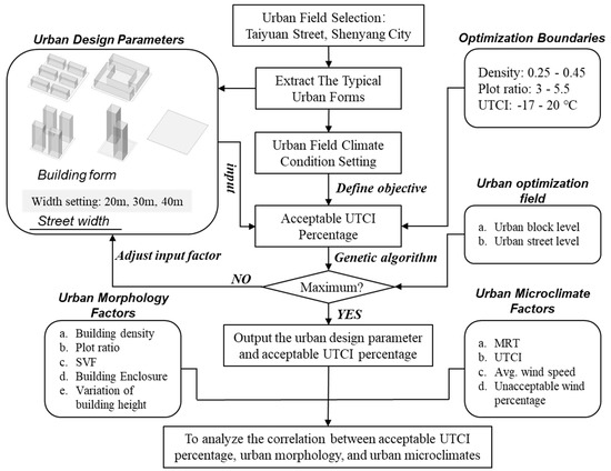 Figure 1 shows the overview of this study. First, this study selected the field where climate condition and typical urban forms were applied. Second, this study defined multiple factors of urban morphology (building density, plot ratio, sky view factors, building enclosures, and variation of building heights), as well as several other factors of urban microclimate (mean radiation temperature, UTCI, average wind speed, and unacceptable wind speed percentage). All these factors were introduced to assess the urban layout optimization. During optimization, the study divided the field into 5 × 5 grids and randomly selected a point in the grid as the measurement point. The objective was defined as the percentage of acceptable UTCI percentage that counts the UTCI results of points reaching setting range. A genetic algorithm was applied as the optimization choice at two urban levels (block and street levels). Finally, this study provided analysis on acceptable UTCI percentages among factors of urban morphology and microclimate, and it discussed urban design strategies.
