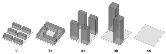 Basic building form extracted from urban block: (a) strip type building form; (b). courtyard type building form; (c). high-rise strip type building form; (d). high-rise dot type building form; (e). open space.