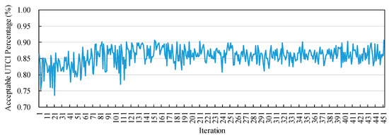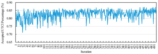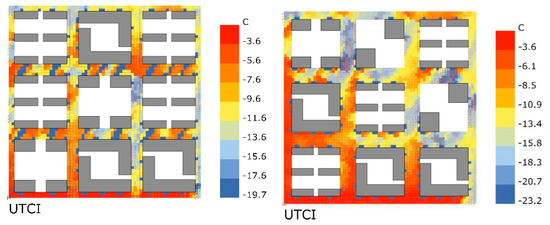 To verify effectiveness of the optimization results, we selected two urban designs for the best and worst acceptable UTCI percentage along with the comfort level. The data in Figure 6 show that, through program optimization, the overall block comfort ratio increased from 73.6% in the poorest case to 87.7%, a growth of about 19%. This demonstrates that optimization can effectively improve the microclimate comfort performance of the whole block combination by searching for the optimal combination of urban morphology.
