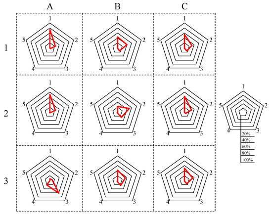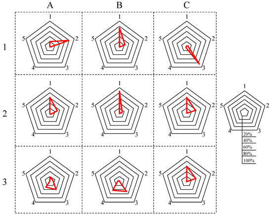 In addition, results through optimization with higher than 85% acceptable UTCI percentage are used to check the building form characteristics that achieved good results. Figure 7 shows the building form distribution, illustrating the percentage of building forms in each block. The whole urban block was divided into nine individual blocks, indexed with columns A, B, C, and rows 1, 2, 3. According to Figure 7, building forms 1 and 2 were the top two types (A1, A2, B1, B2, C2, and C3 block area); building form 3 occurred at a high frequency (A3, B3, and C1); building form 4 did not appear in any high-frequency location of the block, and building form 5 (open space) did not appear in any generation. Multistory blocks 1 and 2 were chosen more frequently than high-rise blocks 3 and 4 and open space 5. Open space significantly reduces the building density of the whole block. Hence, this form must be strictly controlled in the early stage. Based on micro-climate effects, high-rise forms and large-area open spaces will result in surrounding unfavorable wind environments, especially with high-rise form 4 compared to high-rise form 3. In the distribution locations, the high-frequency form at A1 was building form 2 with the highest building enclosure degree, which blocked cold air to the maximum extent and provided protection for the high-level flank of the B1 location. The high-frequency form at the B1 was building form 1, used to shield the northward incoming wind with its front width, and the gap between buildings on its side was protected to a certain extent by the enclosed block on the east side. The remaining high-rise blocks appeared at a high frequency in the southwest corner because it was an upwind shadow area that minimized the adverse effects of high-speed airflow around the high-rise forms.