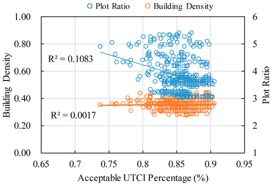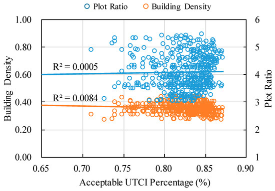 Correlation results of building density, plot ratio, and acceptable UTCI percentage at street level.