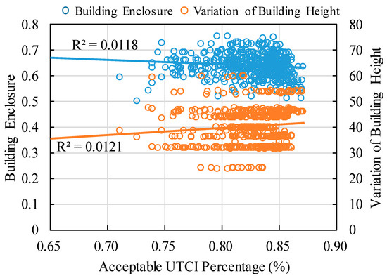 Correlation results of building enclosure, variation of building heights, and acceptable UTCI percentage at block level.