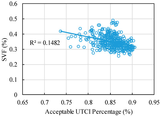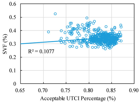 Correlation results of SVF and acceptable UTCI percentage at street level.