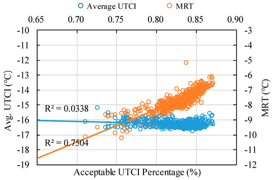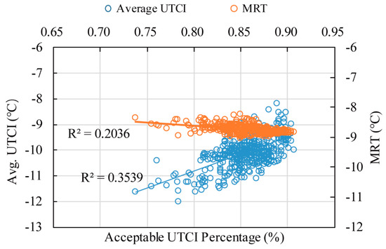Correlation results of average UTCI, MRT, and acceptable UTCI percentage at street level.