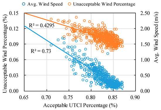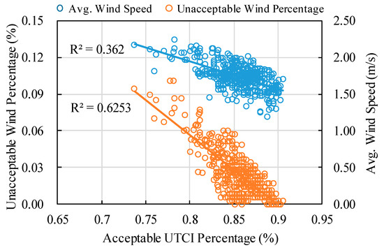 Correlation results of unacceptable wind percentage, avg. wind speed, and acceptable UTCI percentage at street level.