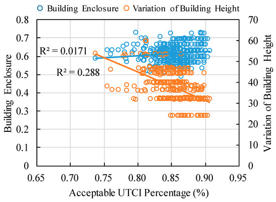 Correlation results of building enclosure, variation of building heights, and acceptable UTCI percentage at street level.