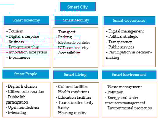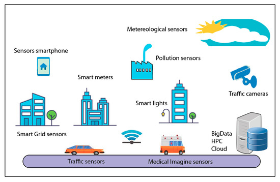 Smart city models are based on the idea of sustainable development considering people as the central axis. They has six pillars: governance, economy, living, environment, people, and mobility [10] (see Figure 1). From this perspective, city managers’ decision-making processes can be improved through the sensorization of the different aspects of the city such as environment, safety, traffic, pollution, and so on, for mitigating and preventing urban challenges. For example, Figure 2 shows a smart city sensor model, which considers the sensorization of different aspects related to industrial automation, pollution, energy, and traffic; the model also includes social interactions generated by people through different social network channels and components of data analytics using technologies such as cloud computing, big data, and high-performance computing (HCP).