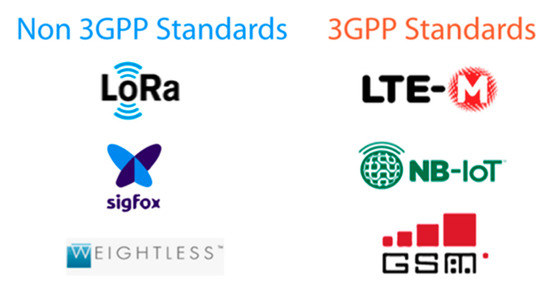 It is known that IoT applications for smart cities require an adequate network connectivity with large area coverage and efficient resource consumption, especially in terms of energy, since most IoT devices use battery for their operation. The low-power wide-area network (LPWAN) was created to satisfy these requirements. LPWAN is a group of technologies that allow long range communications with low power consumption, long battery life (approximately 10 years), acceptable transmission rates, good penetration characteristics, and reduced cost of installation [12]. There are different technologies that represents LPWAN (see Figure 3). Among these, LTE-M, EC-GSM, NB-IoT are considered as 3rd Generation Partnership Project (3GPP) standards, whereas SIGFOX, LoRa, and Weightless are classified as non-3GPP standards. NB-IoT (narrow-band IoT) was released in June 2016 and was developed by the 3GPP consortium; it is compatible with LTE and has a coverage range of 15 km and a transmission speed of around 150 kbps. NB-IoT is a licensed technology which has been deployed in 79 countries with an investment of $598 billion. NB-IoT uses OFDMA modulation. On the other hand, LoRa was developed by Cycleo and was released in 2012 as a non-licensed technology. It has a range of 11 km and a transmission speed of around of 10 kbps. LoRa networks have been implemented in 34 countries with an investment value of $241 billion. Finally, Sigfox is a non-licensed technology which was developed in Toulouse and released in 2009. It has a coverage range of 13 km and a transmission speed of 100 bps [16].