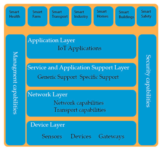 The development of IoT and smart cities has been considered by international organizations, such as the International Union of Telecommunications (ITU), the Institute of Electrical and Electronics Engineers (IEEE), the International Standardization Organization (ISO), and byconsulting firms, such as Gartner and Forbes. Among them, ITU in its recommendation Y.2060 has proposed an IoT architecture that supports smart city subcategories such as smart transport, smart energy, smart health, and smart living (see Figure 5). The architecture considers aspects like IoT devices, network capabilities, services support, and security issues [20].