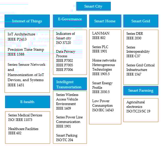 IEEE and ISO have also proposed several standards related to smart city subcategories that cover aspect like interoperability, operation frequency, and security. Figure 6 shows an overview of such standard proposals.