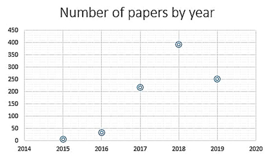 On the basis of the keyword string, we found 900 papers related to IoT and LoRa. Figure 7 indicates the searched papers distributed by year. It shows that 2018 was the year with the greatest number of publications, corresponding to 393 papers.