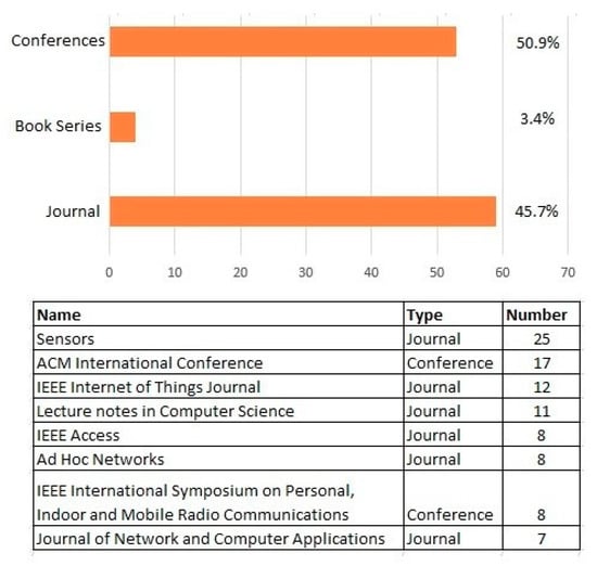 The identified 900 papers were 497 journals papers, 347 conference proceedings papers, and 56 book chapters. Table 3 shows the journals with the major number of papers related to IoT and LoRa from 2015 to 2019 according to our research.