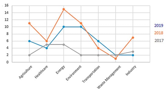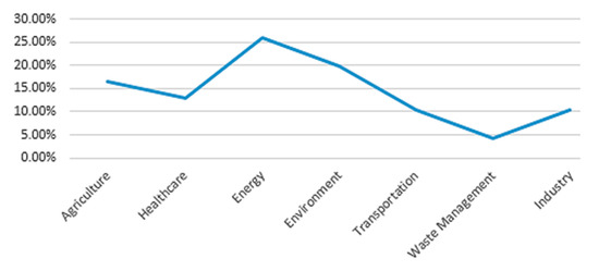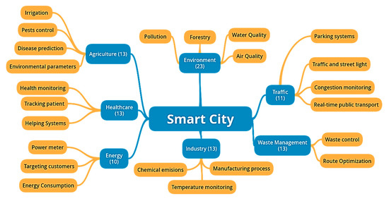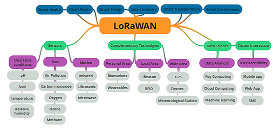 The inclusion of ICT and sensors in different subcategories of the smart city such as agriculture, healthcare, environment, traffic, safety, and industry allows the creation of a strategic vision of the city. The use of LPWAN technologies is considered in smart city because it allows reaching large areas of coverage, while consuming a low amount of energy. Figure 10 shows a basic overview of our analysis of LoRa usage to support different kinds of applications, related to agriculture, healthcare, energy, industry, safety, environment, and traffic. The coverage of LoRa implementations identifies both urban and rural areas.