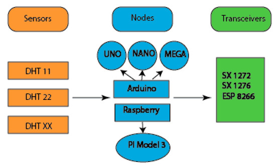 On the other hand, sensors allow obtaining parameter values that are relevant in each subcategory of the smart city. In this sense, we identified three groups of sensors that are the mostly used in IoT solution based on LoRa. The first group of sensors is focused on obtaining parameter values such as pH, loan, and temperature, which are related to operating conditions of certain city domains (e.g., agriculture, energy, and environment). For instance, in agriculture, the pH and temperature values allow the identification of conditions that are suitable for planting or harvesting. In water management, the pH value allows the evaluation of water quality. The second group of sensors includes those devices focused on the measurement of gases (e.g., air pollution, oxygen, and ozone). This type of sensors (according to our qualitative analysis) are greatly accepted especially in the environmental domain to evaluate the levels of pollution in a city. Finally, the third group includes those sensors used for motion detection. These types of sensor have had great momentum with the development of valuable applications such as smart parking (sensors are used for the detection of available parking spaces) and security systems in smart home solutions.