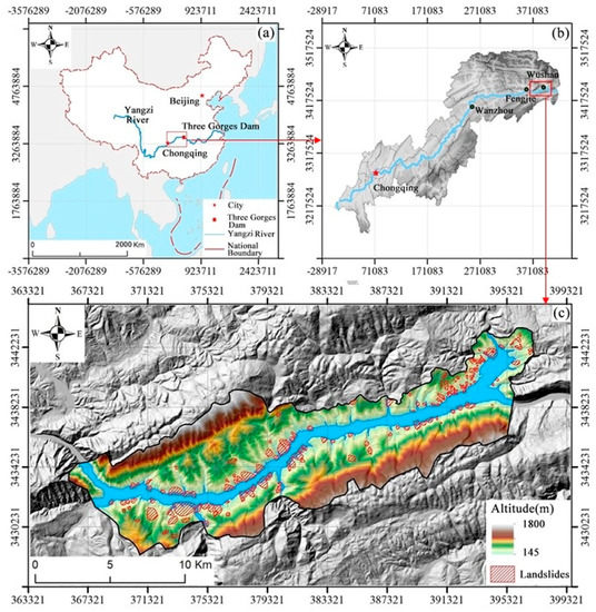 (a) The location of Three Gorges Reservoir area (TGRA) in China. (b) The location of the study area. (c) Elevation map of the study area with landslide distribution (the landslides polygons were obtained from historical landslide data, field investigation, and high-resolution remote sensing image data).