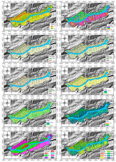 Terrain roughness index (TRI) is an index reflecting the change of surface fluctuation. TRI ranges from 1 to 3.9, and the main range is 1 to 1.2, which accounts for about 70% of the total area of the study area. The continuous factors classified method was applied to classify TRI into four categories (Figure 2h): [1,1.2), [1.2,1.4), [1.4,1.6), and [1.6,3.9]; their information values were 0.338, −1.167, −2.291, and −6.780, respectively (Table 1).