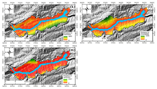 Landslide causal factors of the study area: (a) slope, (b) aspect, (c) curvature, (d) plan curvature, (e) profile curvature, (f) SPI, (g) TWI, (h) TRI, (i) lithology, (j) bedding structure, (k) distance to faults, (l) distance to rivers, (m) distance to gully.