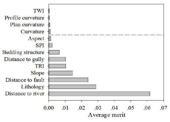 After removing altitude, the importance of each factor in the modelling was quantitatively calculated using IGR, and the results are shown in Figure 3. According to the methodology of IGR in Section 3.1, the factor with larger average merit value made greater contributions to the accuracy of the susceptibility model. The calculation results of IGR showed that distance to rivers was the dominant causal factor in the study area, and its average merit value was 0.061.