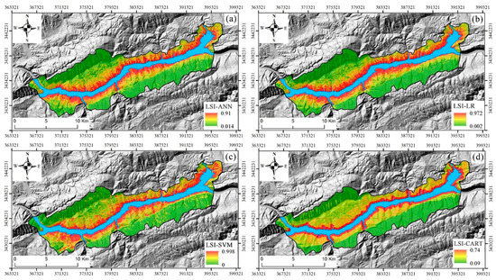 Landslide susceptibility maps obtained from (a) ANN model, (b) logistic regression (LR) model, (c) SVM model, and (d) classification and regression tree (CART) model.